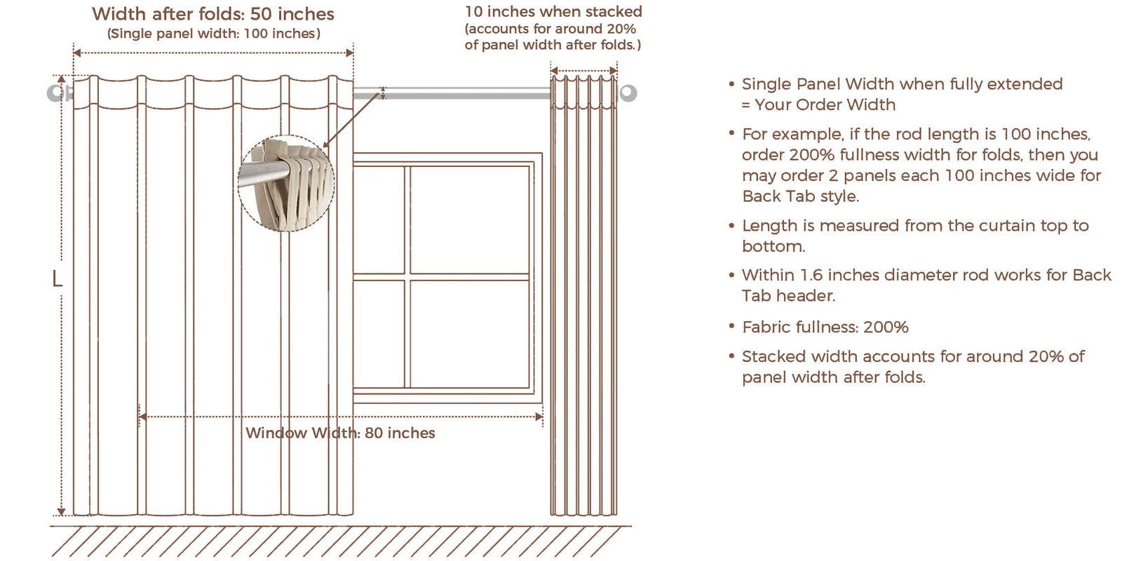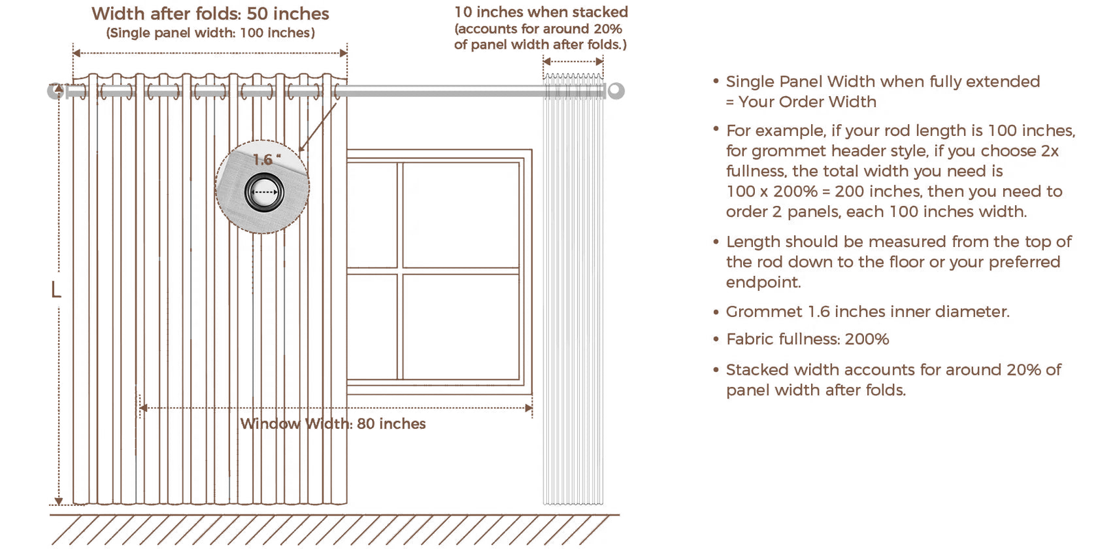 - For Grommet Style, Single Panel Width = (Rod Track Full Length x 200% fullness) / Panel Quantity