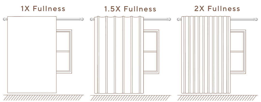 The default fullness is 1 (or 100%), then the drapes should consider 150-200% fullness for final measured width. 150% fullness will produce a more tailored look, while 200% fullness, which is recommended will create a richer, more opulent appearance. Recommended Fullness: