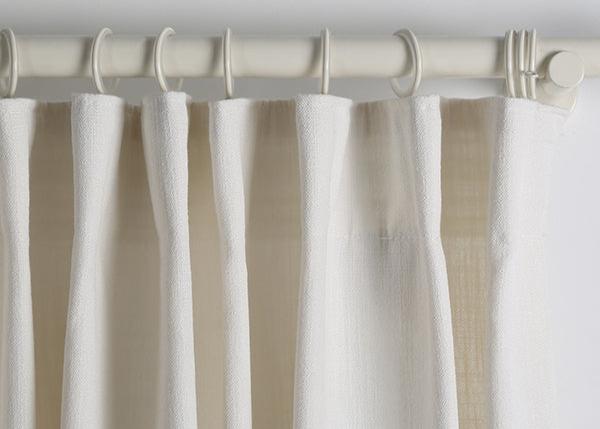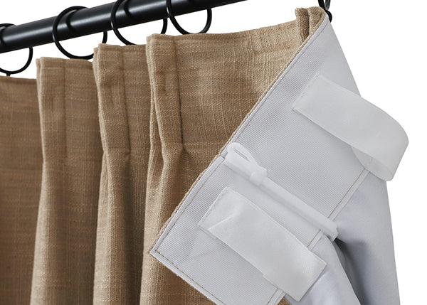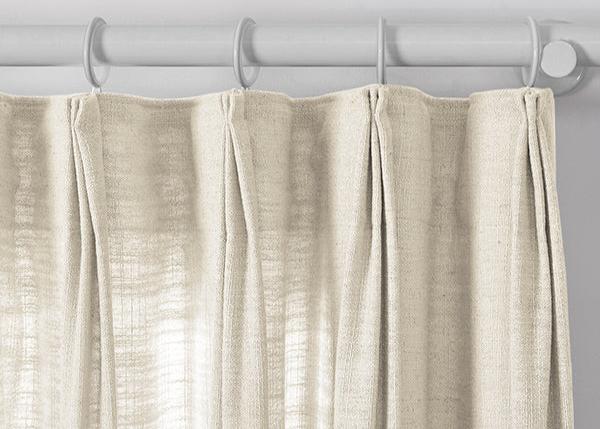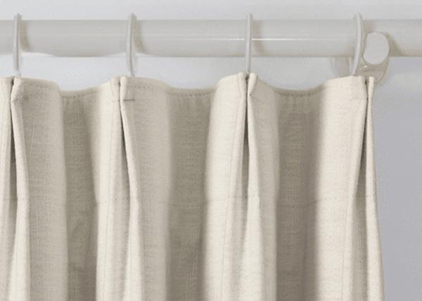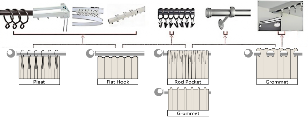 TAPE PLEAT - 3-in-1 construction, the back tab for rod, rod ring clip, and rod with ring eyelet. 1.8x fabric is used for pleats and weaves. Metal hooks included every 9 slots insert a hook.