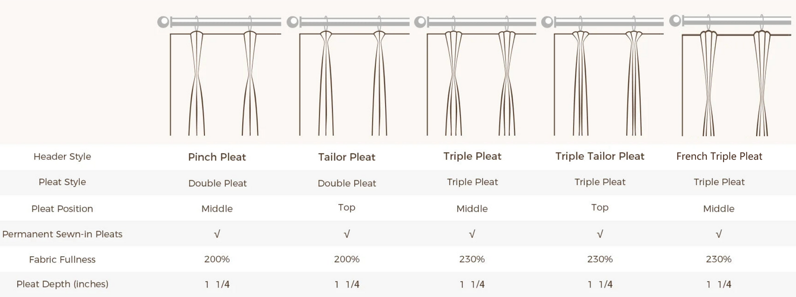 - Triple tailor pleats are more gathered with permanent pleats, spaced 5.5 inches apart.